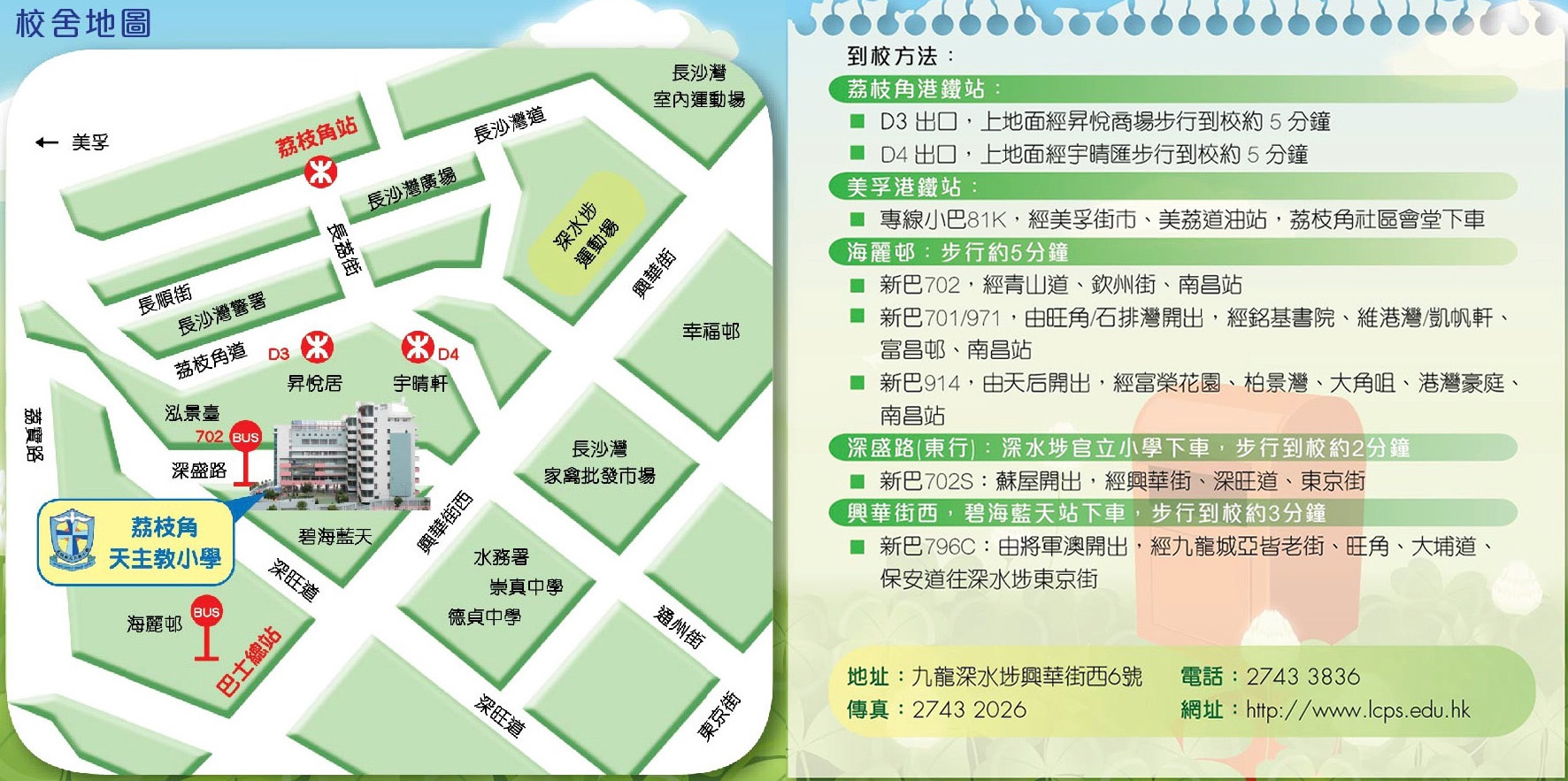 • 專線小巴 81K︰經美孚街市、美荔道油站,荔枝角社區會堂下車,步行到校約 2 分鐘